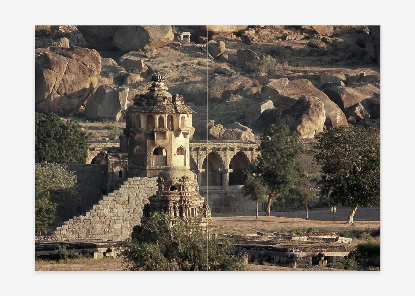 The tour of Vijayanagara begins beside the Tungabhadra River in the village of Hampi with the Virupaksha temple, the only ancient shrine still in active worship. From here visitors are conducted on an itinerary through the enclosures of Royal Centre, where they will see the Lotus Mahal and famous elephant stables. Here, too, is the huge solid platform where ceremonies of the great Mahanavami festival took place, surrounded by excavated basements of palaces and bathing pools. The tour concludes with a description of the Vitthala temple, in front of which stands the celebrated stone chariot (now on the 50 Rupee note).