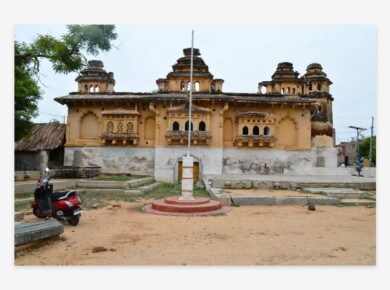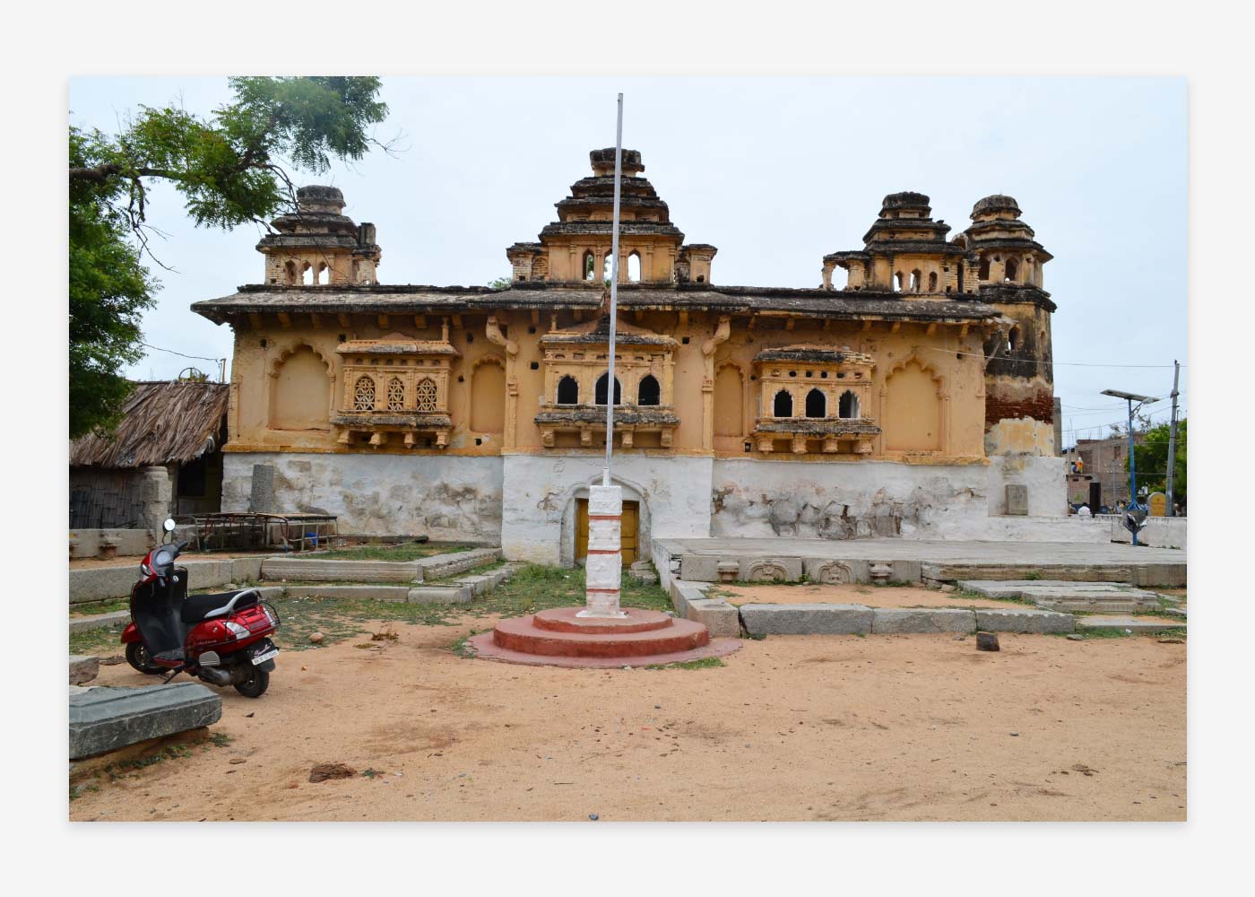 The Gagan Mahal in the village of Anegundi, is situated across from the ruins of the medieval city of Hampi Vijayanagara, on the opposite side of the Tungabhadra river. A rare example of a complete pavillion from the sixteenth century Vijayanagara period, it is structurally intact and includes charming balconies surveying the adjacent village plaza and fanciful towers that emerge from the upper storey.