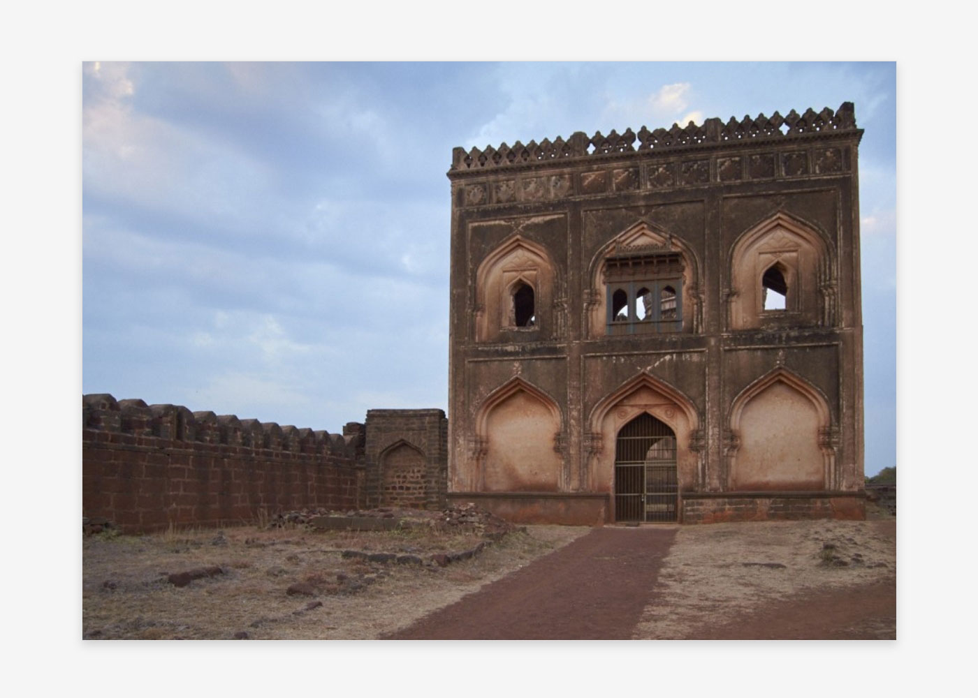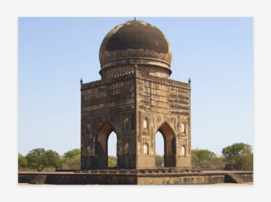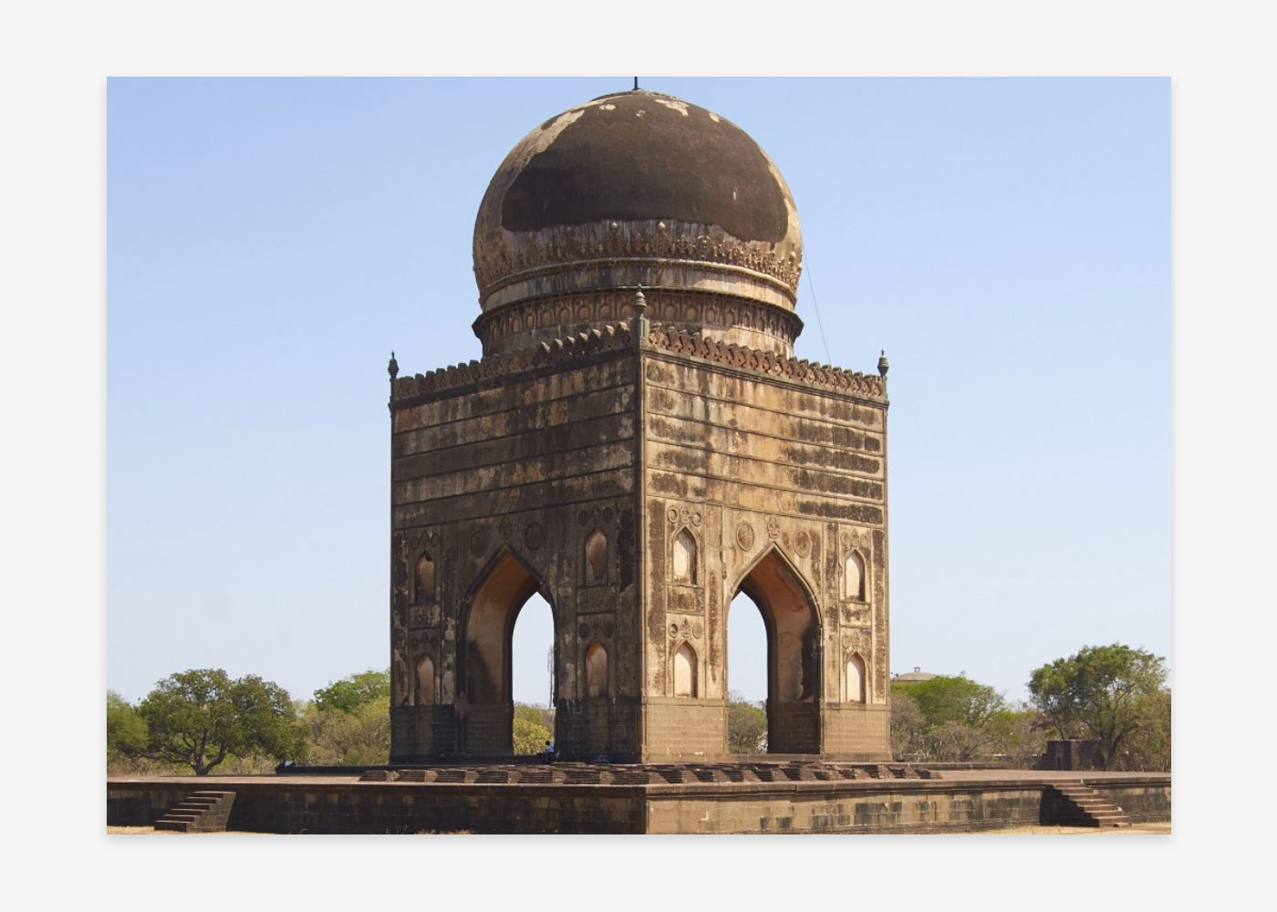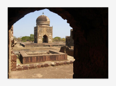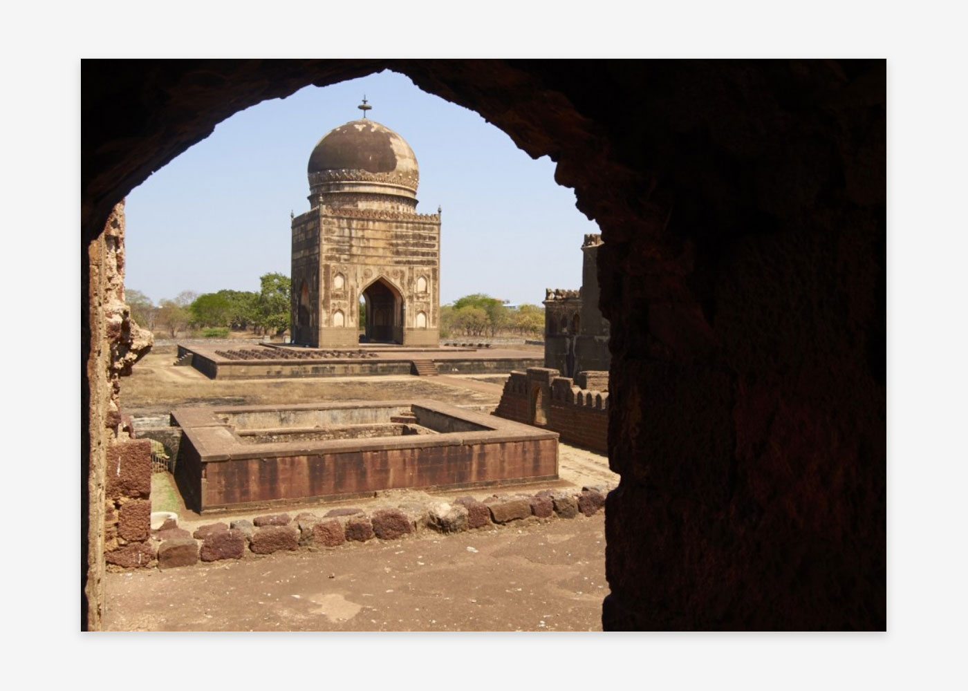Around the tombs, traces of two historic gardens are evident along with their accompanying waterworks systems. The first and smallest garden located within the mosque/pilgrim’s hostel compound belonging to the majestic mausoleum of Ali Baridi is entirely symmetrical, the first of its type in the Deccan and probably India. This symmetrical garden precedes the Chahar Bagh architectural landscapes of the Mughals in Hindustan by approximately 20 years. The second is a meadow garden distinguished by a mango orchard.